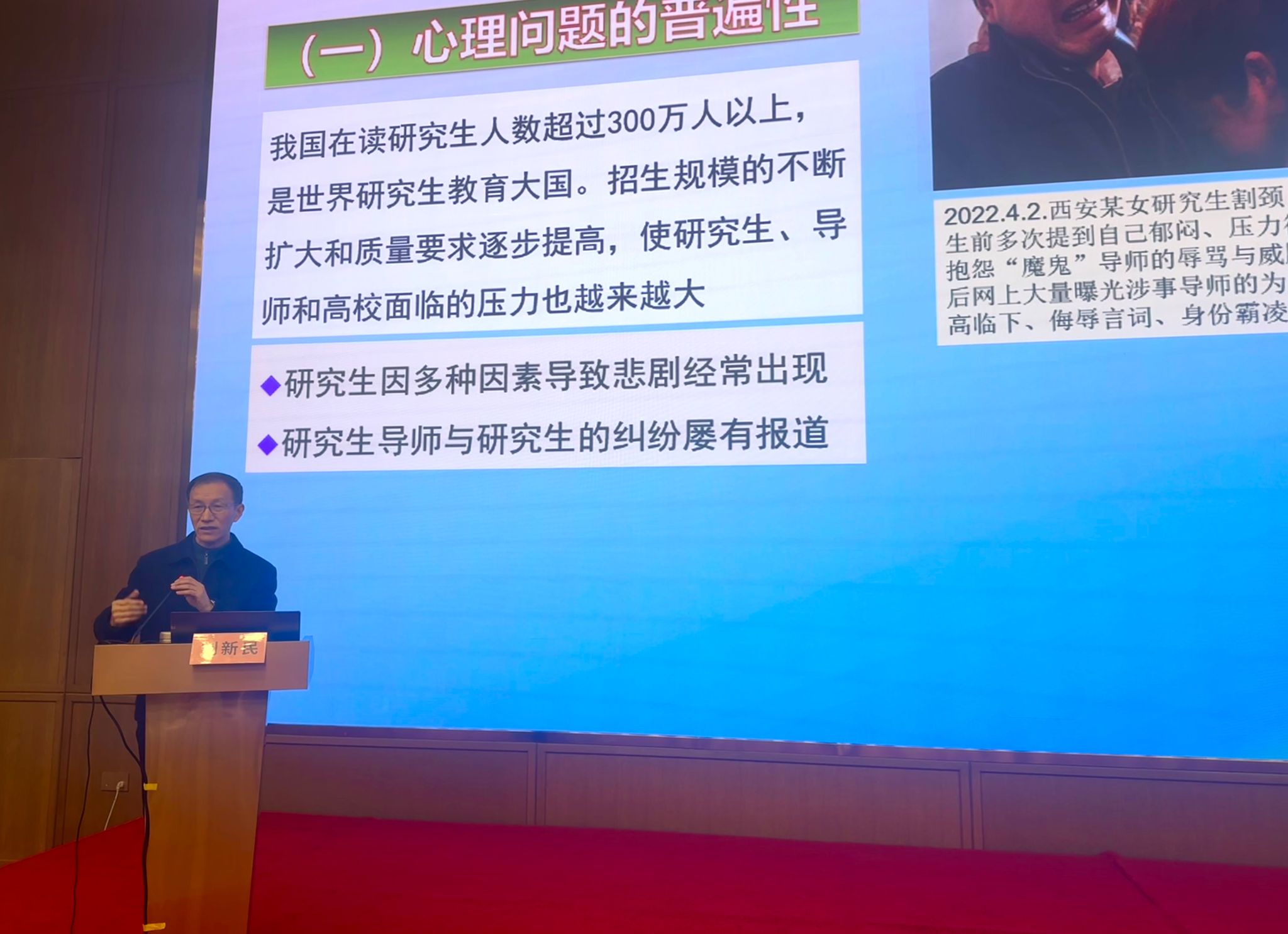 安徽省教学名师、省2021年“百姓学习之星”、应用心理学与司法精神病学教授刘新民作了题为“提高心理识别能力,助力研究生健康成长”专题讲座。他深入浅出地阐述了心理健康的重要性,详细列举了心理危机的多种类型及科学的判断方法。同时,结合自身丰富的工作经验,具体讲解了导师在应对心理健康问题时如何发挥关键作用,提供了宝贵的实践指导。