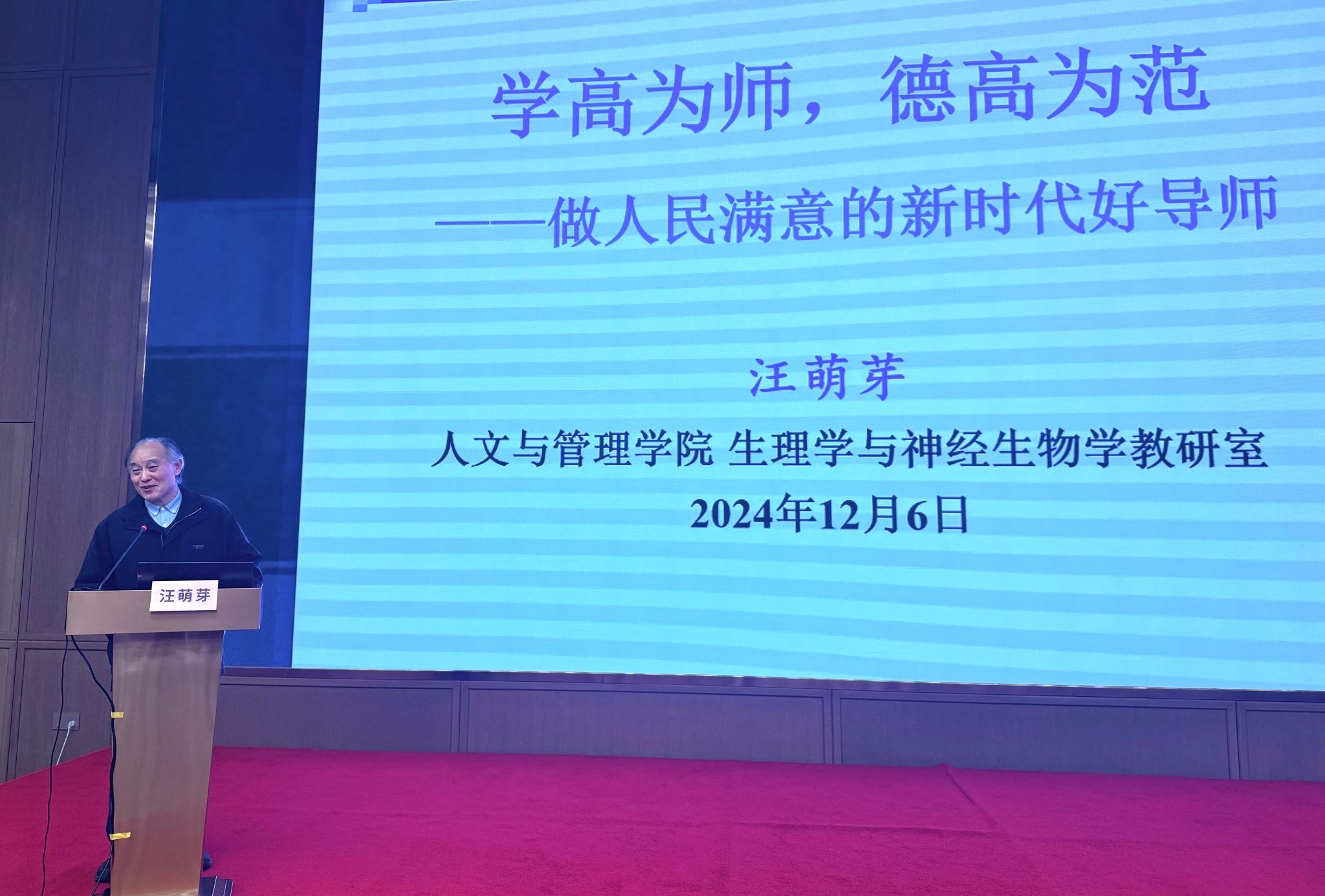 省级学术与技术带头人、安徽省教学名师、人文与管理学院教授汪萌芽应邀作了题为“学高为师,德高为范——做人民满意的好导师”专题讲座。他围绕“四有”好老师与教育家精神、学术道德与邹承鲁院士的基本原则、学术道德与师德师风管理体系、学术不端及其惩治等方面,呼吁与会导师共同营造风清气正的学术环境,为学生树立良好的榜样。