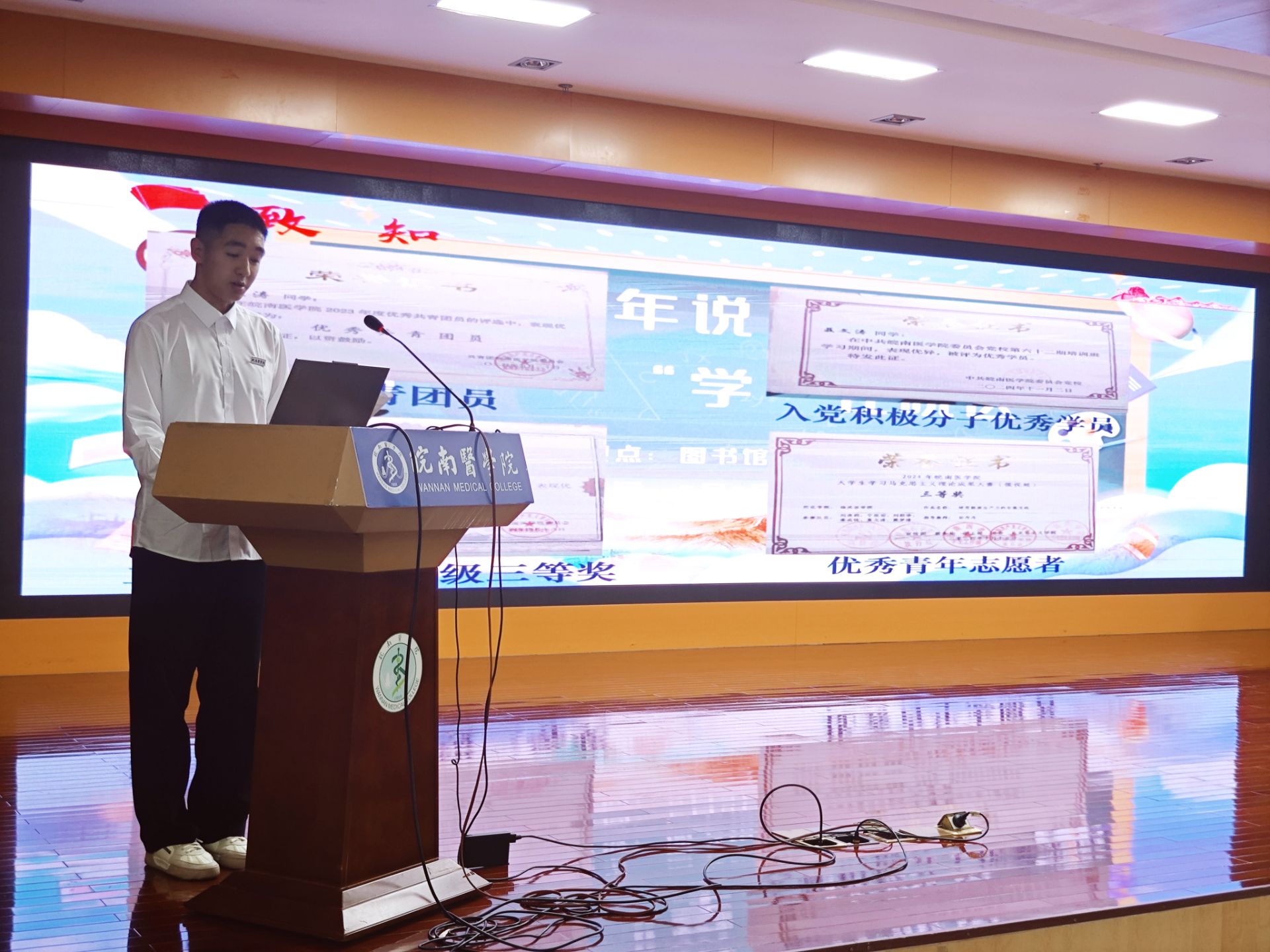 2023级临床专业聂文涛同学以“有爱帮助,照亮前路”为题分享了医学学习中的互助故事,传递携手同行的温暖力量。他表示从高中到大学,国家、学校的资助始终是照亮求学路的光;进入大学后自己躬身实践、笃行不怠,通过课堂与图书馆的日夜深耕让专业成绩稳步提升;主动组织建立学业帮扶小组,互相讲解难点、共享笔记资源,把自己的学习方法与大学生活经验化作实在的分享,既是对学弟学妹的指引,更是将曾经获得的光亮进行传递。