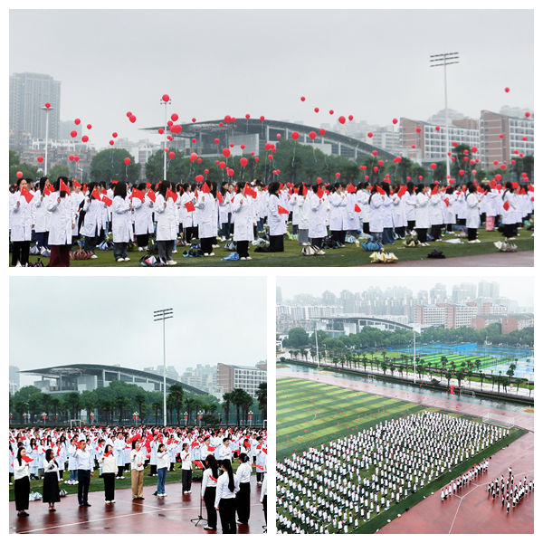 仪式在全体师生合唱《歌唱祖国》中达到高潮。歌声嘹亮,红旗飞扬,伴随着深情旋律,师生们手持气球,将祝福凝聚于掌心。在主持人的号令下,红色气球腾空而起,如青春誓言飞向苍穹,现场红旗挥动,化作一片欢腾的海洋。