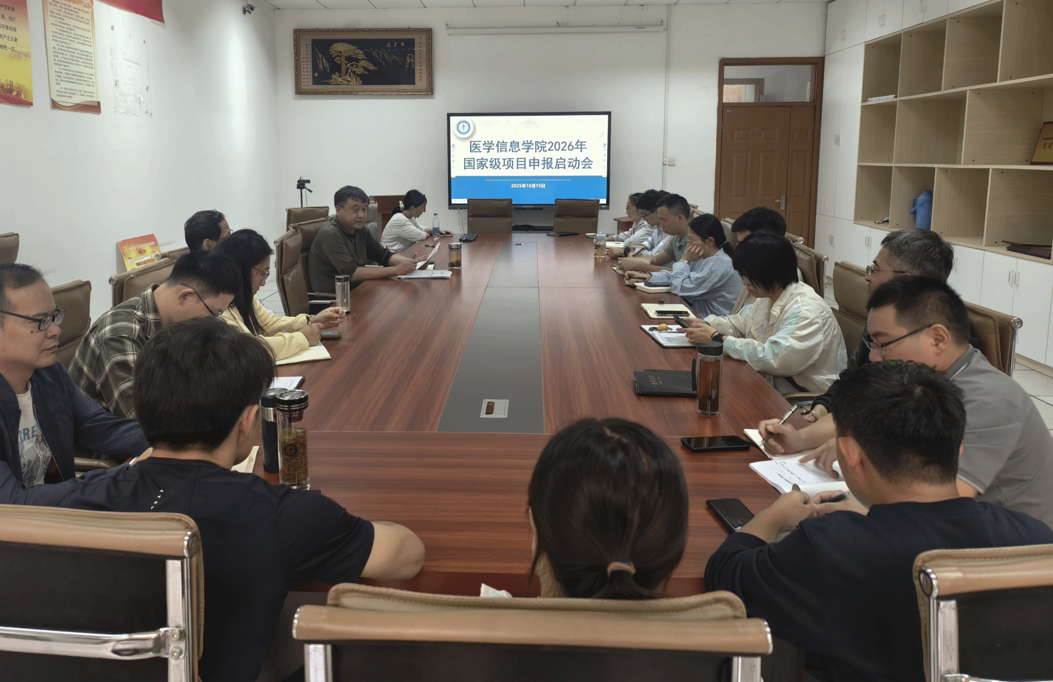 10月15日下午,医学信息学院召开2026年国家级项目申报启动会,进一步凝聚科研力量、提升申报质量,力争在国家级项目申报中实现新突破。学院各教研室负责人、高级职称、博士教师及骨干教师参加会议,学院执行院长叶明全主持会议。