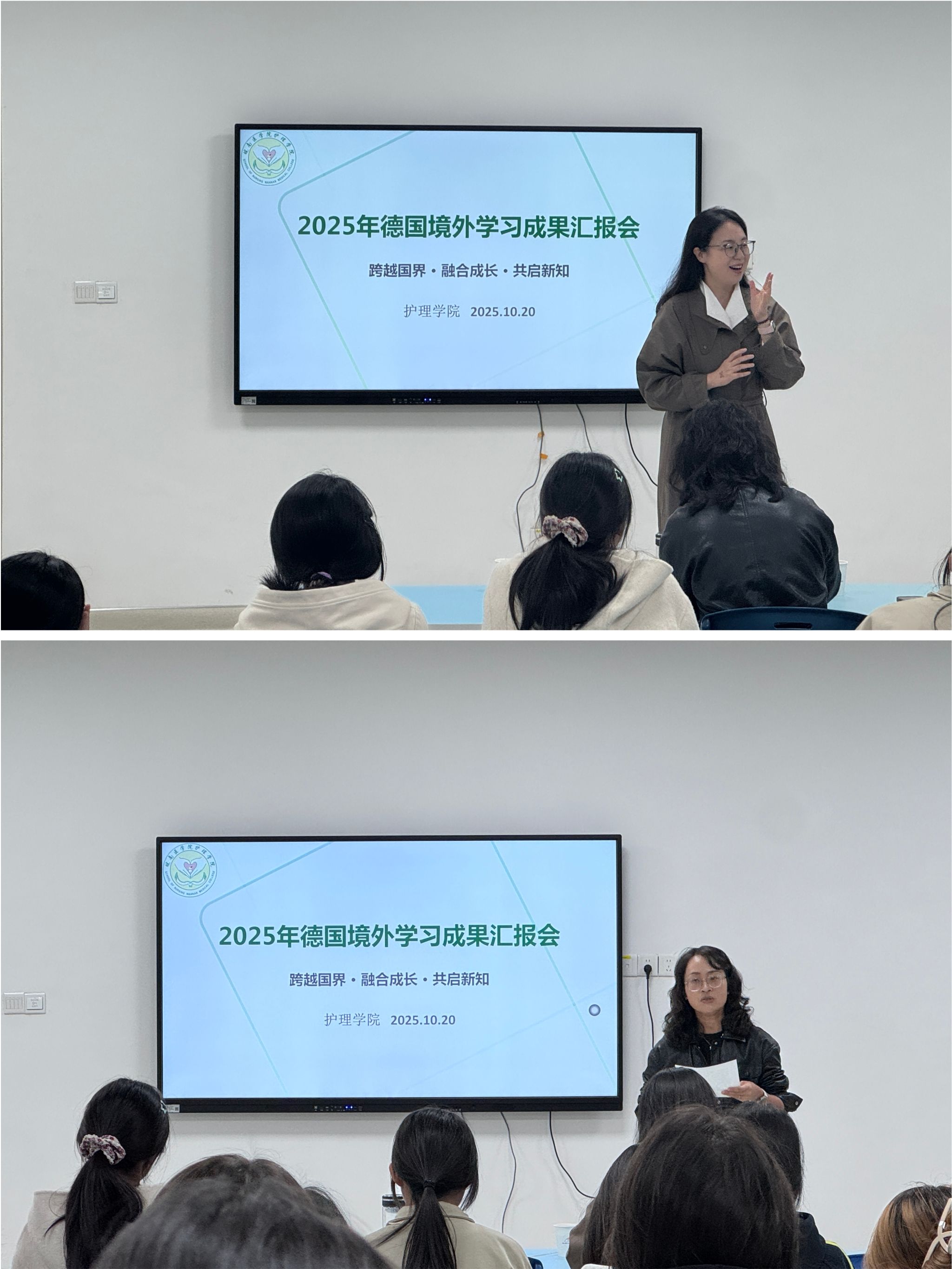 10月20日晚7时,护理学院中德班2025年暑期德国研学成果汇报会在滨江校区南区东一楼1118教室举办。国际合作与交流处副处长蒯文婷、护理学院党委副书记王亚娟、国际合作与交流处杨伟琼老师和相关年级辅导员及2024级、2025级中德班全体同学参加活动。