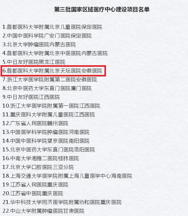 近日,国家发展改革委、卫生健康委、中医药局联合公布《第三批国家区域医疗中心建设项目名单》,首都医科大学附属北京天坛医院安徽医院入选项目名单,标志着我校一附院“一院两区”建设迈出新步伐,高质量发展取得新成效。