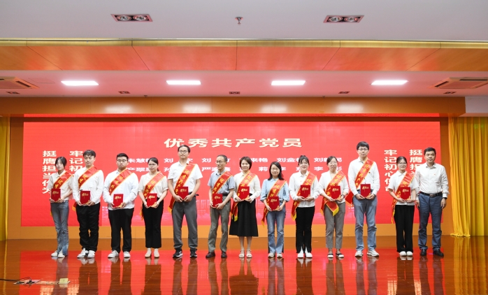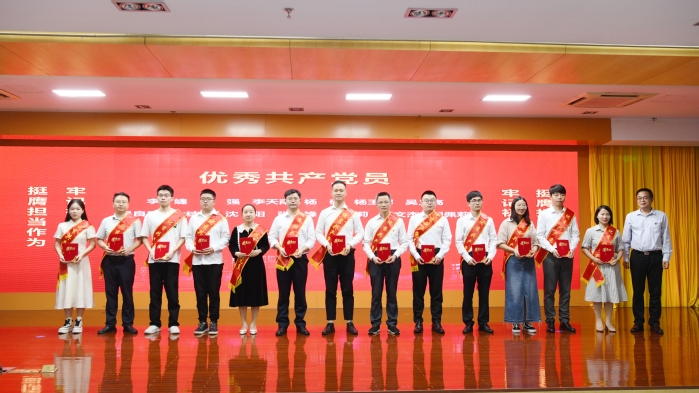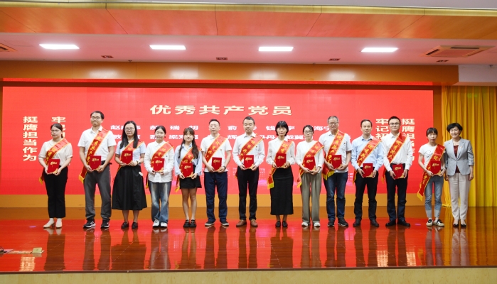 在欢快喜庆的旋律中,党委书记夏劲松向“光荣在党50年”党员代表颁发纪念章,预备党员向老党员们敬献鲜花。校领导依次为受到表彰的集体和个人颁发证书和奖牌。