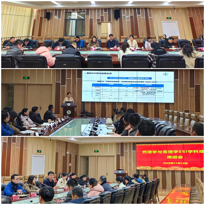 为加快推进学科建设,精准研判学科发展方向,提升学科影响力,11月14日下午,药学院在4号实验楼二楼会议室牵头召开药理学与毒理学ESI学科建设工作推进会,研究生学院副院长赵金红、公共卫生学院副院长金岳龙,科研处、相关学院及附属医院骨干教师、青年博士参会,清华大学汪舰教授应邀参会。会议由药学院党委书记、副院长李娜主持。